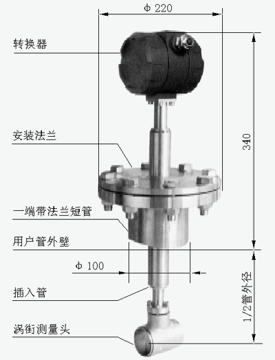 將渦街測量頭插入管道特定位置,通過測量該位置的局部流量,根據(jù)管道截面流速分布關系,計算出管道內平均流速值。它由轉換器、插入桿組件、球閥( 根據(jù)需求配 )、安裝短管(ф100)、渦街測量頭等組成。